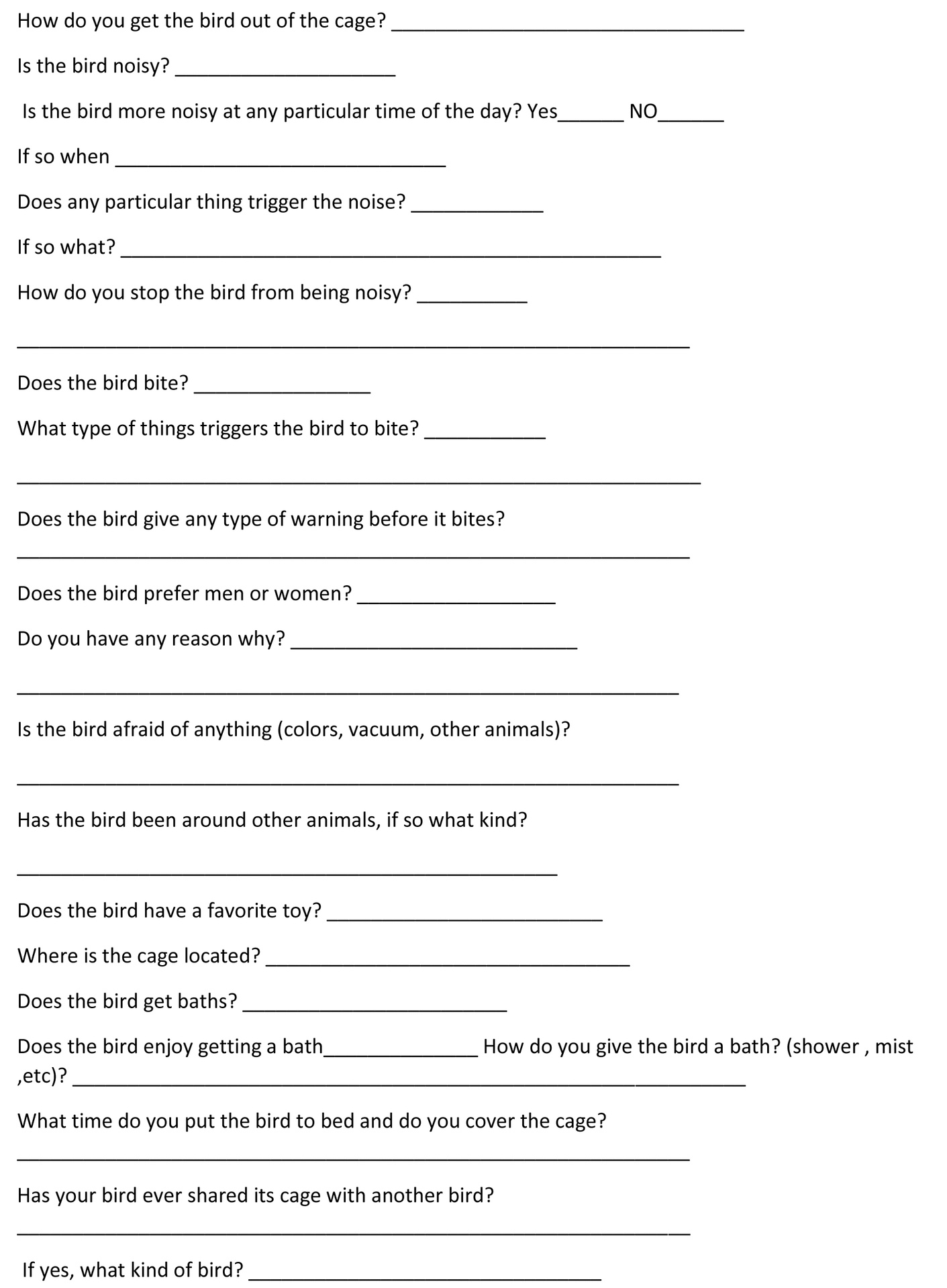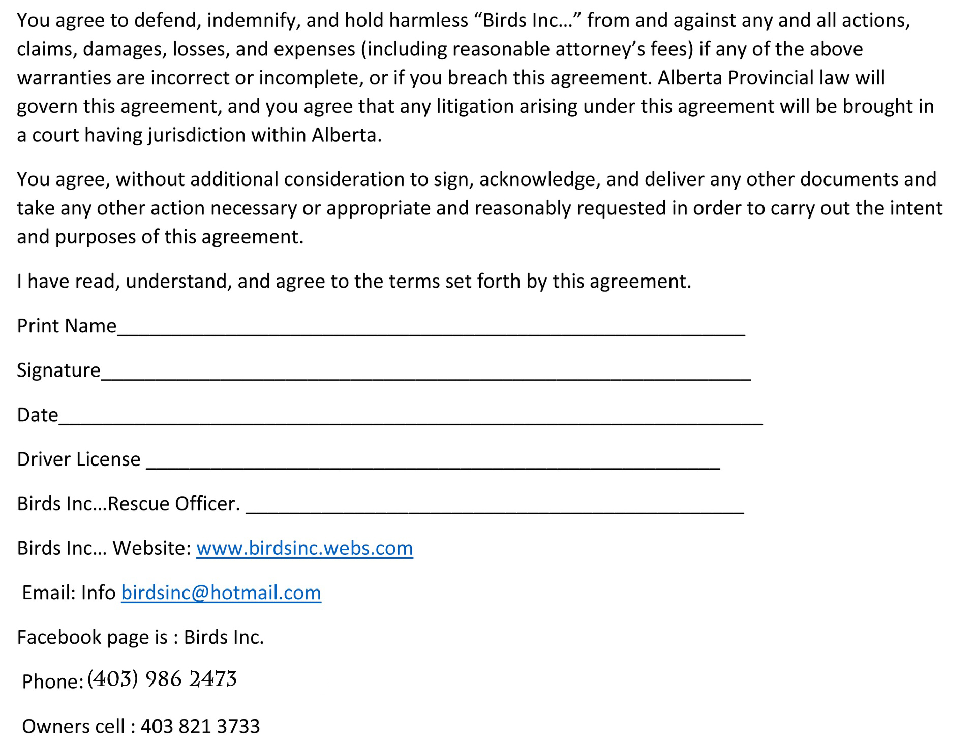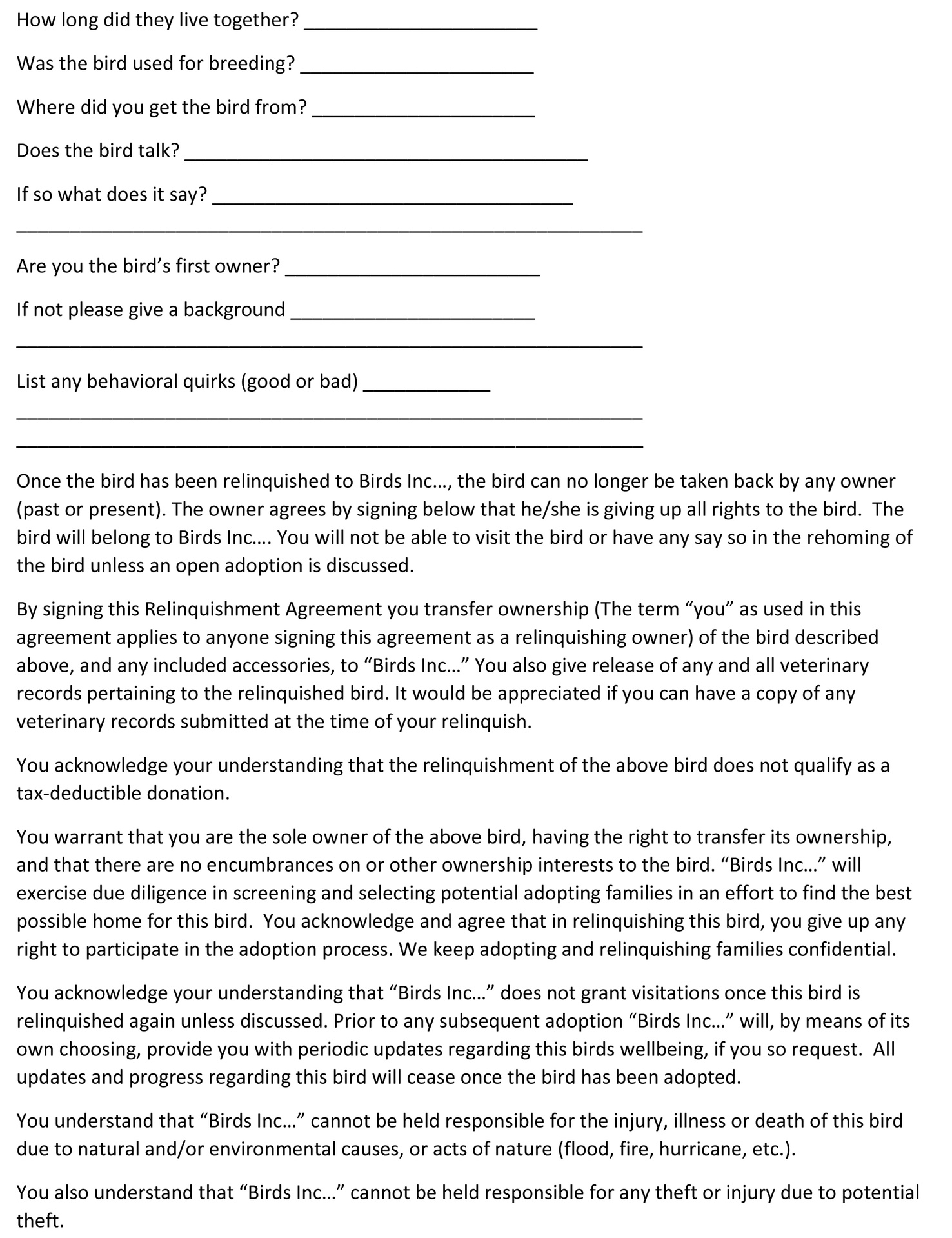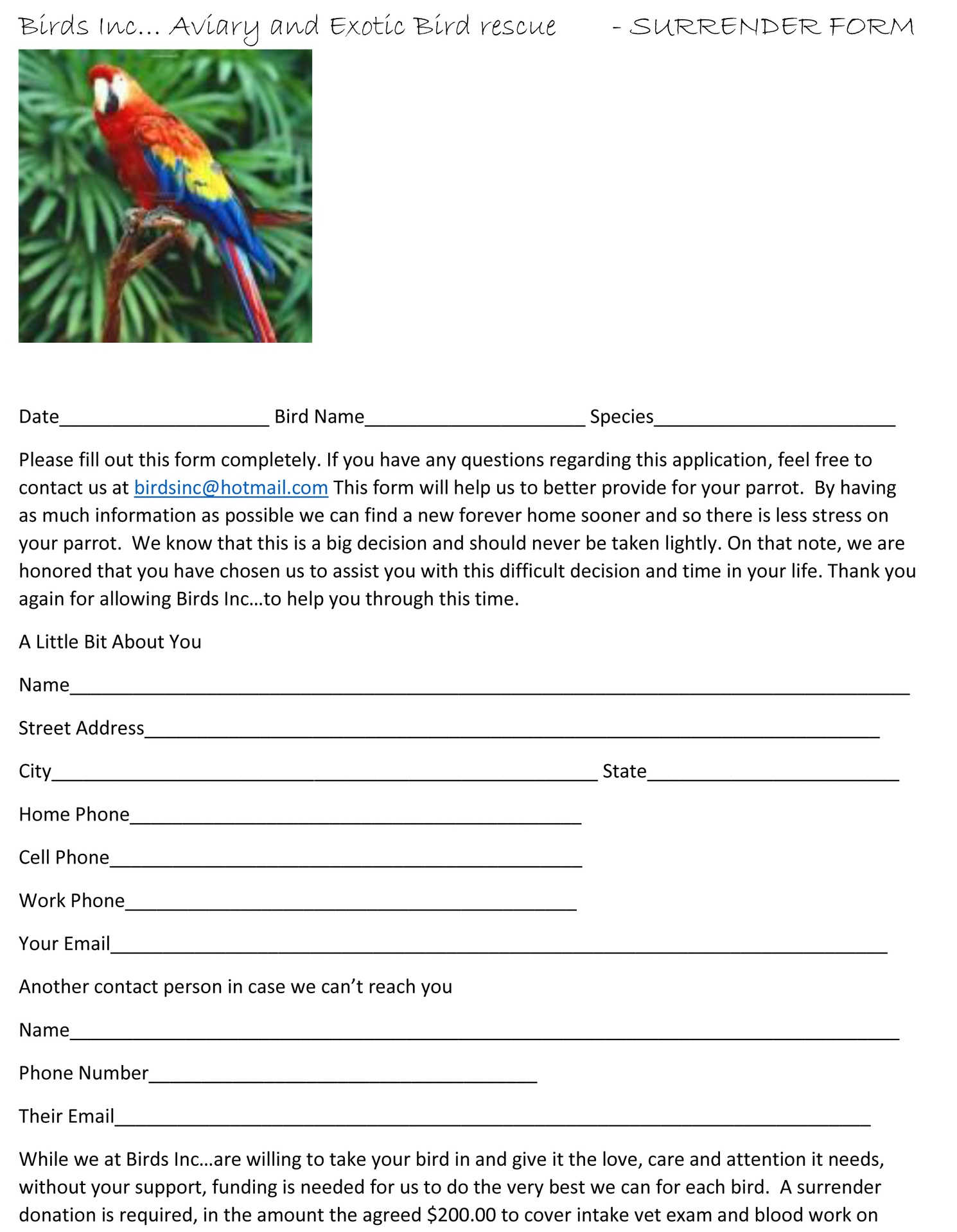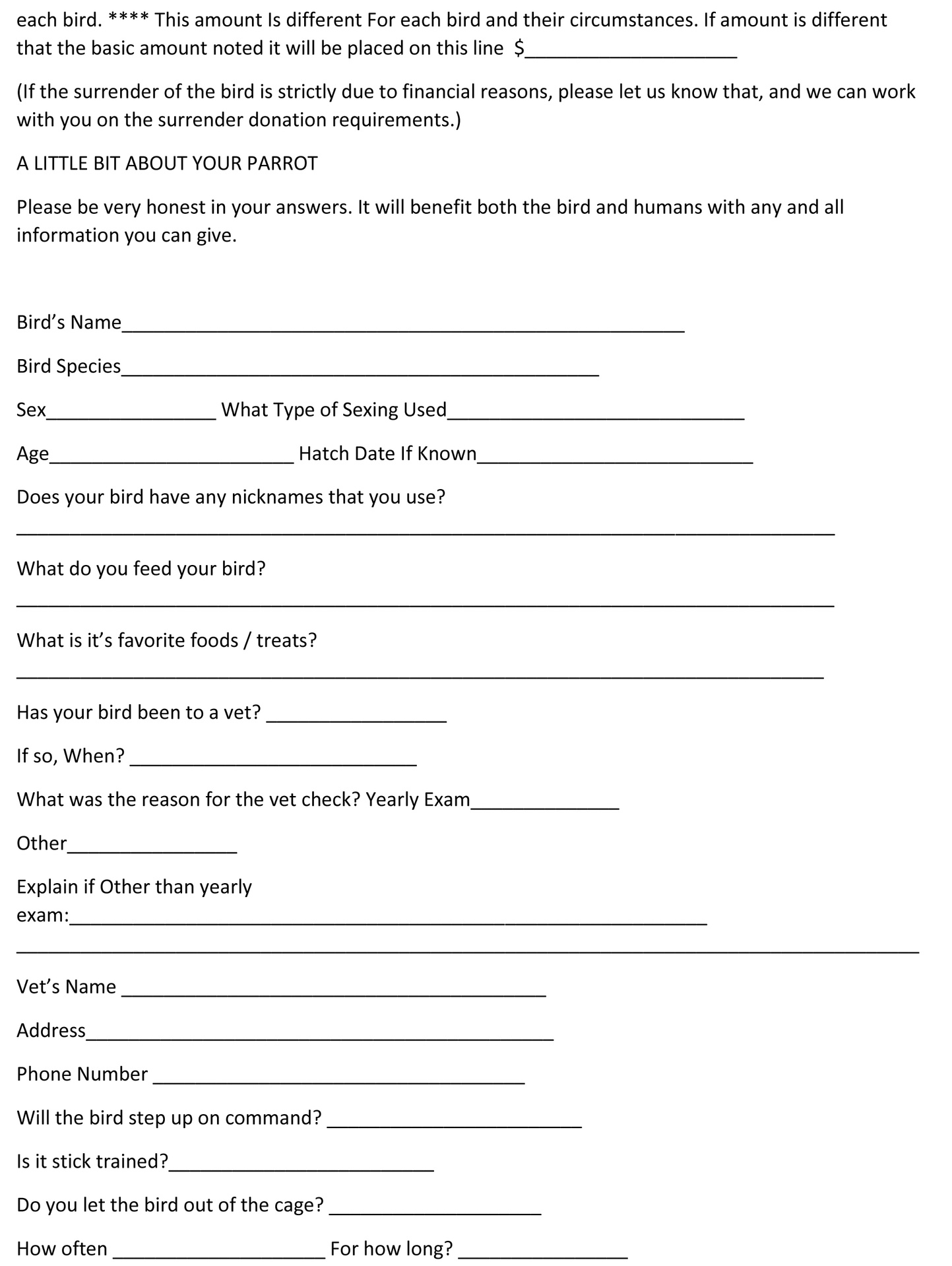 Below are the links to our Surrender Form. Surrender fees may apply. Please Print all 5 Pages of the form and fill them out before surrendering your bird. Unfortunately we are only able to link individual pages on this website. We hope that you will understand and we want to thank you for giving your bird a second chance at life. It is often not easy to let go of an animal, but by letting go you are giving your animal the best chance for a healthy, peaceful life.
