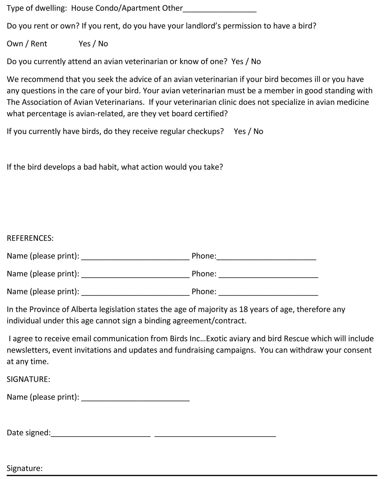 Below are links to printable pages for the adoption form. Adoption fees may apply. Please print all 3 pages of the form, fill them out and submit them to Fredrick Coates through email or in person. Unfortunately, we can only link individual pages on the website. We hope you understand and we want to thank you for your consideration in adopting one of our birds.